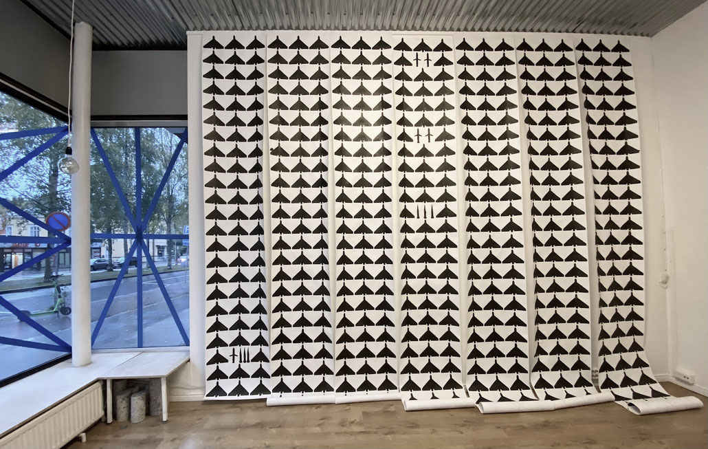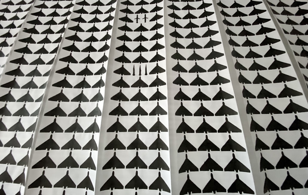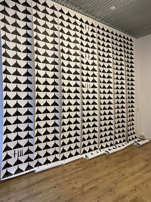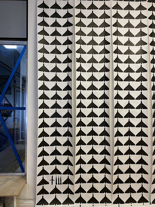 The installation is based on a parallel with the familiar school essay “How I Spent My Summer” (a tradition in Ukrainian education and in other countries), but instead of childhood memories, it is Ukraine’s account of its summer under russia’s massive attacks. I collect dry statistics from the Ukrainian Air Force and transform them into an artistic process: on a white roll of paper, the silhouettes of drones and missiles are hand-printed in numbers corresponding to the daily strikes, preserving their outlines.